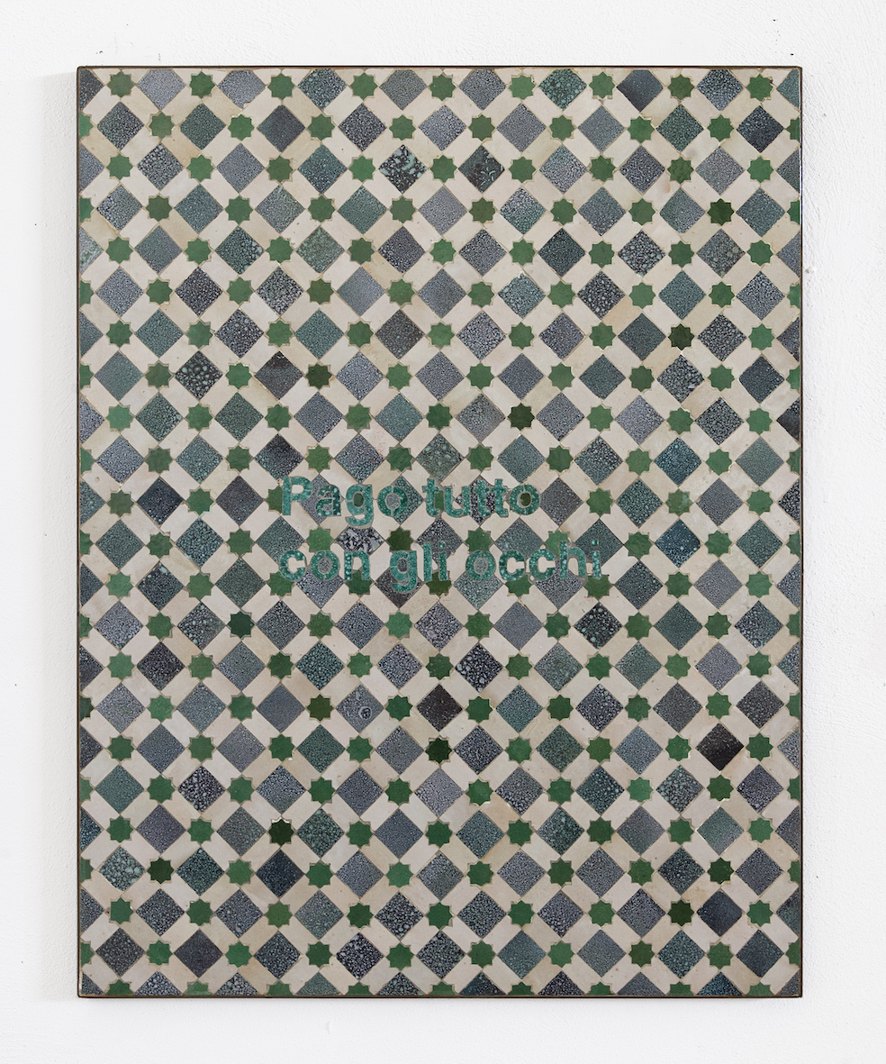 Diego Miguel Mirabella was born in Enna in 1988; currently he lives and works between Bruxelles and Rome. He attended at the Academy of Fine Arts od Rome and, from 2010 to 2013, he started a collaboration as assistant in the Pietro Fontana’s studio. Among his solo shows: Vestiva inoltre una segreta felicità, MAR Museum, Ravenna (2024); Porta su di te ciò che vuoi, Studio Sales di Norberto Ruggeri, Rome (2024); Una boccata d’Arte – Molise, Piazza XX Settembre, Agnone (2023); Scoprivamo il sole, Museum of Turkish and Islamic art, Istanbul (2022); Decorato decoroso distratto, Studio SALES di Norberto Ruggeri, Rome (2021); Il castone e la barota, Studio SALES di Norberto Ruggeri, Rome (2019); Room#12, Rue petite Boucher, Bruxelles (2018); Salvo me, Richter Gallery, Rome (2018); La bocca arsa, l’Ascensore, Palermo (2018); L’alba ti scopre nella stessa posizione, Un vetrina, Rome (2015); Andiamo là, L’a project, Palermo (2014); Per terra non cade, MAP Museo dell’AgroPontino, Pontinaia (2013); Entrano fuggendo, Operativa arte contemporanea, Rome (2013); Presupposti per un dialogo inesatto, Palazzo Lucarini, Trevi (2013); DiaSige, Museo d’arte Moderna e Contemporanea, Anticoli Corrado (2011). Among the group shows: UNAROMA, curated by Luca Lo Pinto e Cristiana Perrella, MACRO, Roma (2025); Collettiva personale, Piano b, Roma (2024); The talent prize 2024, GNAM – Galleria Nazionale d’arte Moderna, Roma (2024); Le porte del futuro, Porta San Giovanni, Roma (2024); Le tentazioni di Apollo, PRAC Museum, Ponzano Romano (2024); D3cam3ron3- the other way around – Palazzo Lucarini Contemporary, Trevi (2024); l’oro blu, Museo dei bronzi dorati della città di Pergola, Pergola (2024); Imagina, Biennale di Gubbio, Palazzo ducale, Gubbio (2023); Nella pittura. Roma capitolo I, Il Frantoio, Capalbio (2023); Frammenti da lontano, Galleria Mazzoli, Modena (2022); Arte circolare, Conai, Maxxi Museum, Roma (2022); Patrimonium Appiae. Art crossing. Archeological Park Appia, Roma (2022); Monopoli panorama, Italics, Monopoli (2022); Frammento e Ornamento, Castello Ducale, Ceglie Messapica, (2022); Coppe di stelle nel cerchio del sole, Palazzo Abatellis, Palermo (2022); Materia Nova, GAM, Rome (2021); Portaportese, Spaziomensa, Rome (2021); One clover and a bee and revery, Moonens foundation, Bruxelles (2021); La comunità inoperosa, Palazzi Ducale, Tagliacozzo (2021); Babies Are Knocking, Studio Stefania Miscetti, Rome (2021); Talent Prize 2020, Museo Pietro Canonica, Rome (2020); Iniziamo qui, Galleria Frediano Farsetti, Milan (2019); What goes arounds comes to art, London art trade, London (2018); All&parts, Rivoli gallery, Bruxelles (2018); Talent prize, Macro, Rome (2017); 10 years 60th Drawings, Fondazione Pastificio Cerere, Rome (2015); Il peso della mia luce, Operativa arte contemporanea, Rome (2013). Prizes: Cantica21, winner (2020); Talent Prize 2020, finalist (2020); Spazio Cima, winner (2017); Special Prize Clima, winner (2017). Mirabella focus his poetics on the relationship between poetry and language and on the visual translation of these two concepts. A natural restlessness leads him to realize a heterogeneous corpus of works, which he organizes into different projects. A continuous tension between what is shown and what is hidden to the viewer is a common mark of Mirabella’s corpus of works. This is an attempt to create “the necessary condition to write a poem” in the artist’s words. Indeed, the world of the literature and writers and elements from theatrical construction have a direct influence on his work. In many of his projects Mirabella uses the imaginary and the culture of other artists or artisans in order to investigate the boundary of communication and exchange between himself and “the other”, creating works that spring from this conflict. Fascinated by the ornamental technique of Moroccan mosaics, in 2017 he gave life to the project “But me” which led him to work with local artisans in Fès, Morocco.